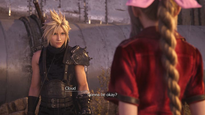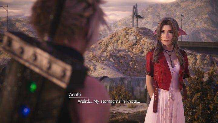 But then, after being asked by Cloud if she’s gonna be okay, she confirms but then grows confused as to why her stomach is suddenly in knots, as if her body and spirit know what happens next, but her mind doesn’t.