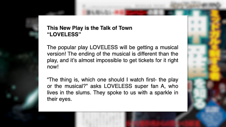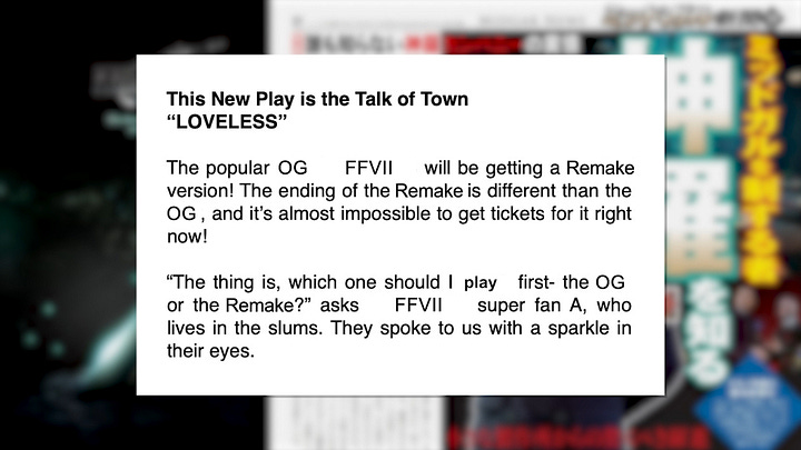 While this alone is just a nice parallel to the real world, the fact that they even included those articles does support the theory about Remake representing LOVELESS act five. The line about the ending being different in the musical compared to the play also further points towards Remake ending differently than the original did and thus bringing the story of Final Fantasy VII to an end.
