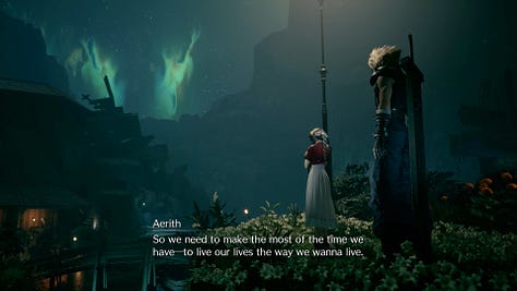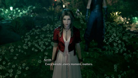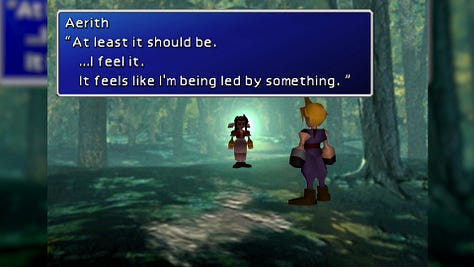 In any case, could there be more to Aerith’s feelings? If this first game in the Remake project takes place in the Lifestream’s memory, the whole compilation has already taken place in the real world. If we assume that—even after resetting and rewriting the timeline—all events from the whole compilation of Final Fantasy VII left an imprint on the new timeline, Aerith could very well feel it all or receive glimpses.
