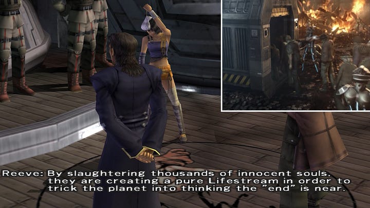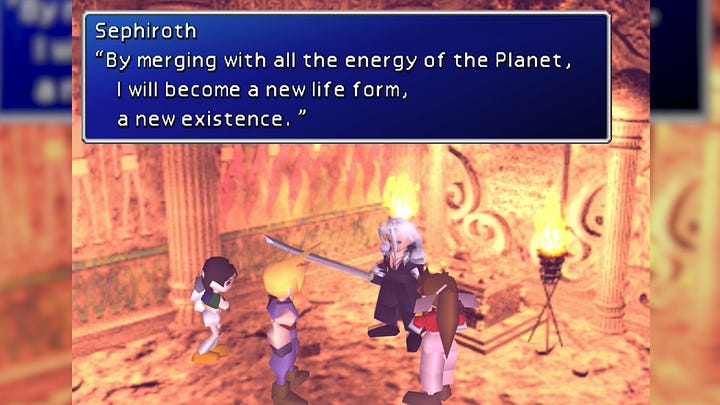 Which brings us back to Sephiroth succeeding at crashing Meteor into the planet, initiating his true end game. An end game alluded to by Aerith’s opinion about how Sephiroth aims to save the planet, which was revealed in the Material Ultimania Plus book’s game script chapter.