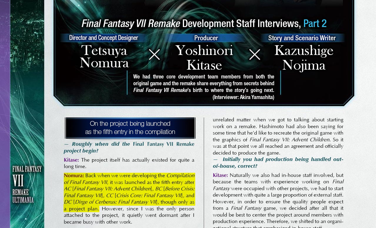 Moreover, in the Ultimania interview, director Nomura-San confirms that the Remake represents the fifth installment in Final Fantasy VII’s compilation and has been planned to be so for a long time.
