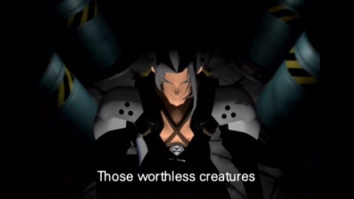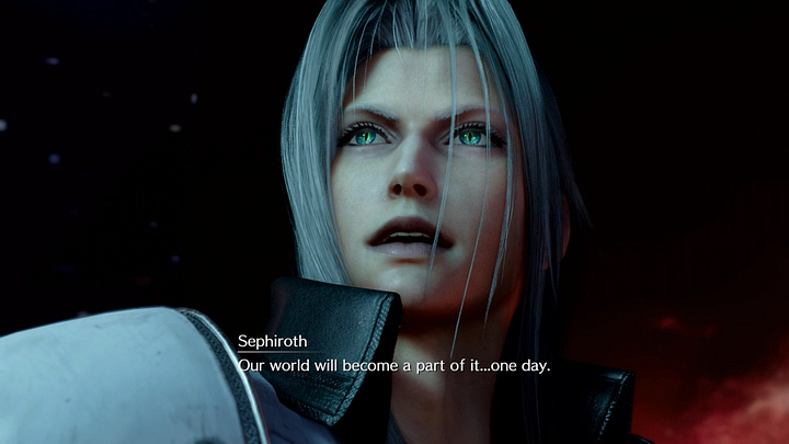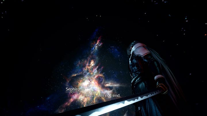 He says while looking at the bright nebula above, his new world. So that’s what it’s all about. He wants to travel the cosmos for all eternity and basically become the arbiter and ruler of life itself. And he needs Cloud to achieve this goal. Without Cloud, Sephiroth cannot succeed…