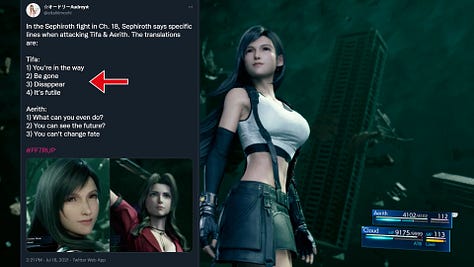 Alright, before we finally conclude this gargantuan analysis, let me show you a few interesting bits of possible foreshadowing for the new ending proposed before. Sephiroth needs Cloud’s help to defy destiny. This is a big hint towards a new strategy that involves using Cloud to change Sephiroth’s current destiny.