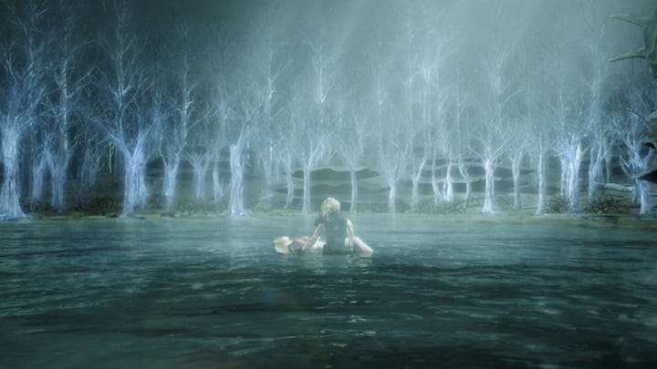 Moreover, the visions of Aerith praying and her Holy Materia falling into the pond below and glowing on its floor are a new creation, like Platefall and the Reunion at the Whirlwind Maze in chapter 3 and both either have or will come true.