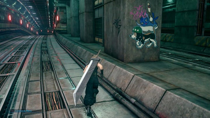 Now, where else do we see that blue alien? It’s also seen above another Stamp graffiti between train tracks showing the way in chapter 5 as well as on the vending machine in Wall Market that sells The Sauce.