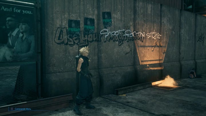 At the sector 7 train station, among other places, we can spot graffiti saying: “Use your imagination” and “Shoot for the stars.” Theorists, use your imagination! The characters will literally shoot for the stars. Omega Weapon does shoot for the stars in that sense, doesn’t it?