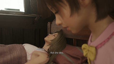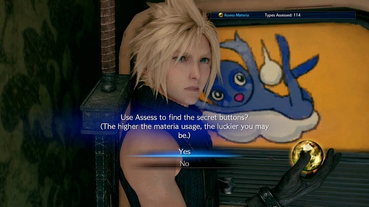 Final point: Cloud’s decision within those seven seconds until the end might also have been foreshadowed. You might remember Don Corneo’s question to the three Avalanche Kittens before he pulls the lever to send them into the sewers. The player, and by extension Cloud, receives exactly seven seconds for answering Corneo’s question. If you don’t select one of the three options, the scene continues after those seven seconds and chapter 9 ends.