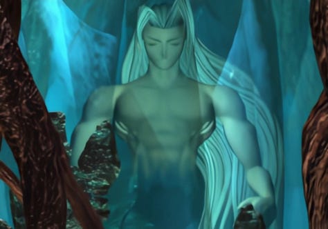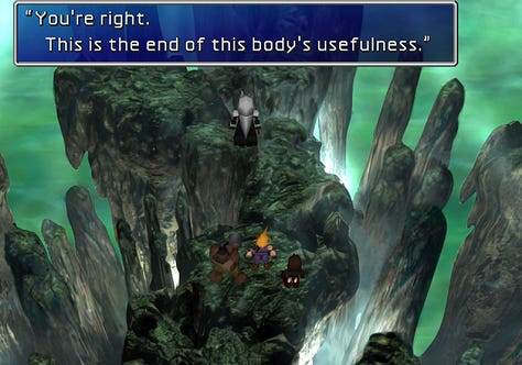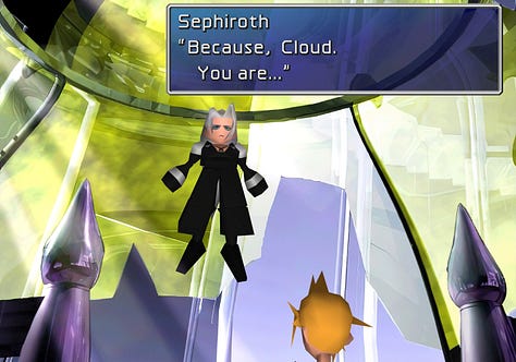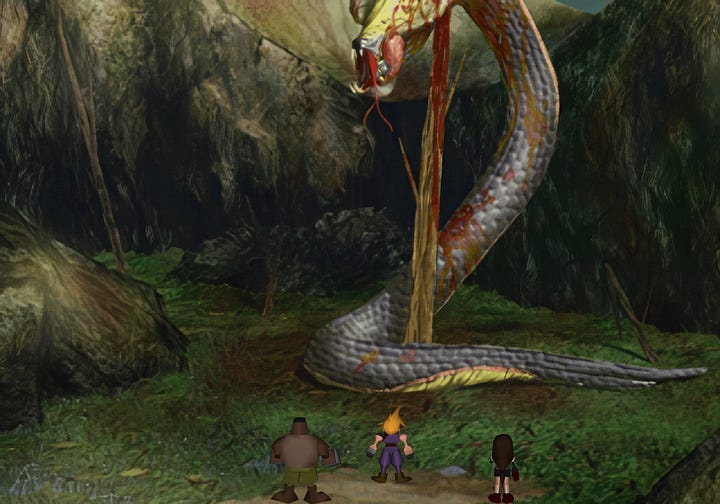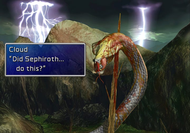 Turns out that this man in a black cape was Jenova’s body in disguise7 and also the one who “turned” into Sephiroth to slay another one of those giant serpentine beasts by dropping it on a dead tree turned oversized stake.8