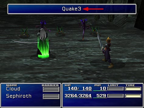 It’s important to note that Cloud’s team mates all watch and witness this unmatched display of strength, though only the part after the Midgardsormr breaks the water surface, flies through the air, and turns into Schlangenbrot.17 Meaning, they don’t actually see Sephiroth doing it. Keep this in mind.