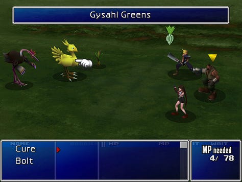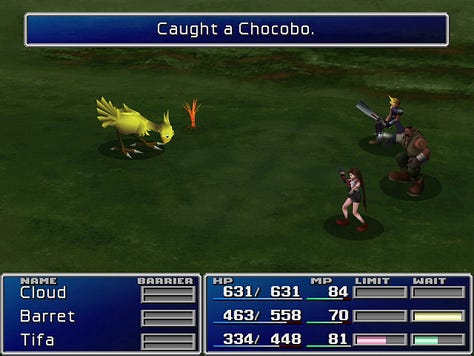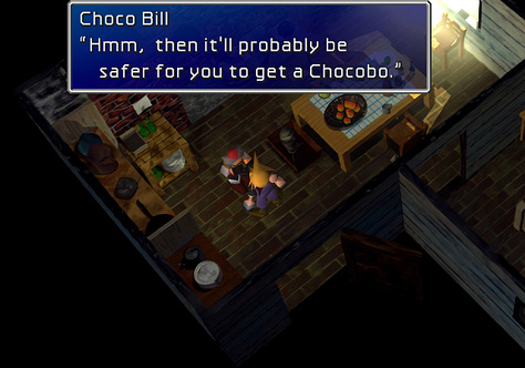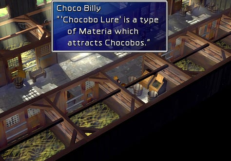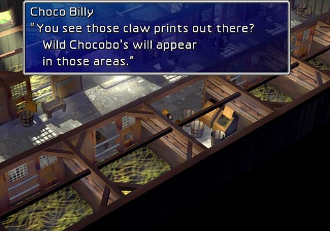 When you reach the Chocobo Farm—either directly or after realizing the serpentine guardian of the swamp won’t let you pass—Chocobo Bill tells you that you need one of the yellow feathered friend to outrun the Midgar Zolom.