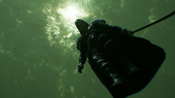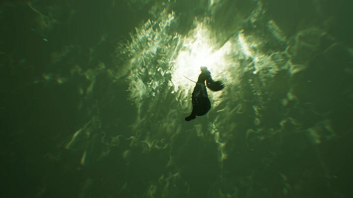 Underwater again, we see only Sephiroth from below against the sunlit water surface. From quite the distance, I might add. When we see Cloud again, he’s right below Sephiroth. In a space where no Cloud was present during the past minute or so.