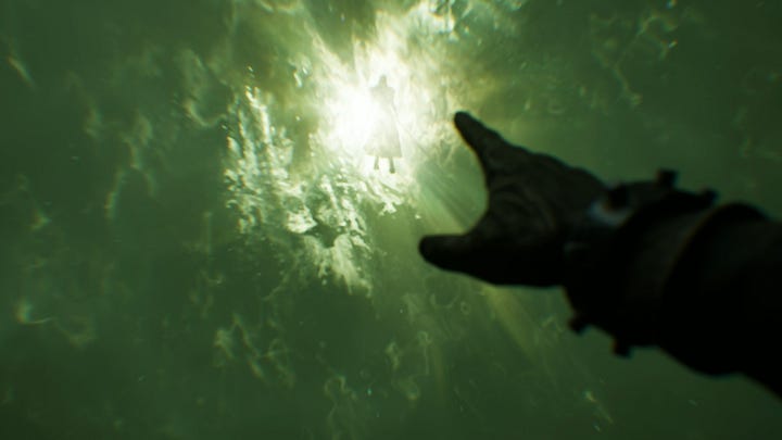 Underwater, Sephiroth looks back at a still conscious Cloud who reaches out to him.