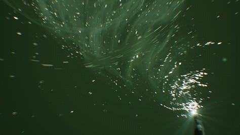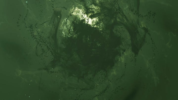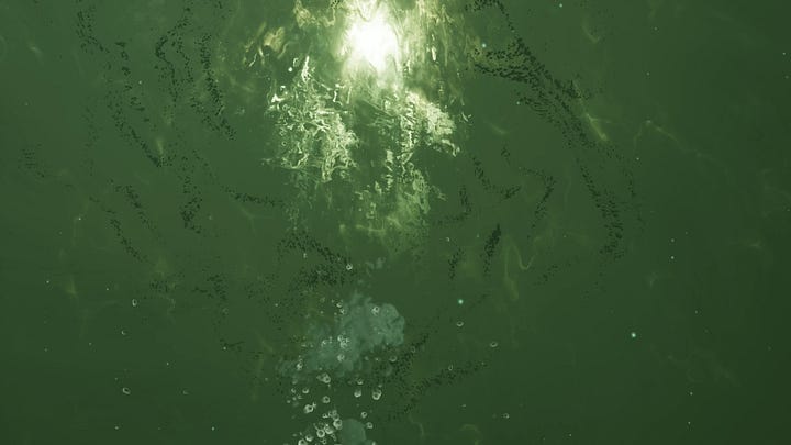 More importantly, this green memory glitch effect directly leads into a gathering of black and purple particles right above Cloud. In fact, Cloud’s oxygen bubbles are ascending right into the center of that black and purple particle vortex.