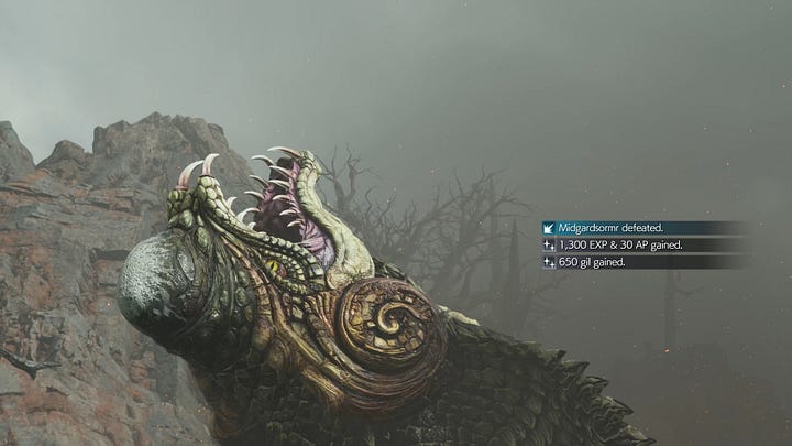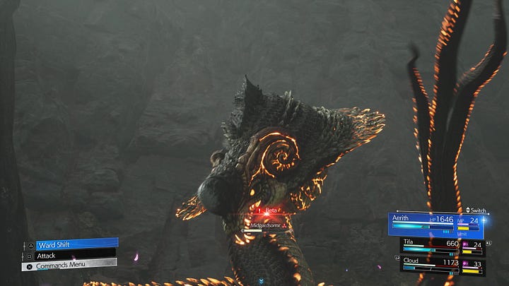 The battle against the Beta-casting and character-ejecting early-game serpentine “super boss” called Midgar Zolom. Or rather Midgardsormr, now properly spelled like its Norse mythological counterpart.2 Not quite world-encircling but large enough to warrant being called like that.