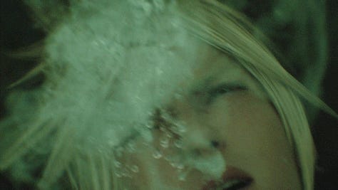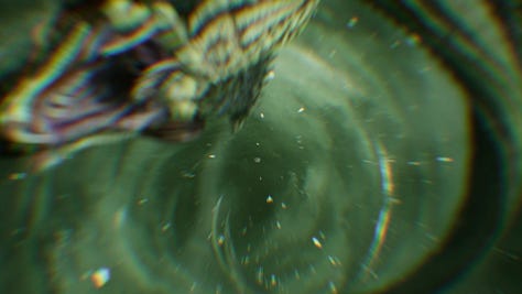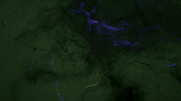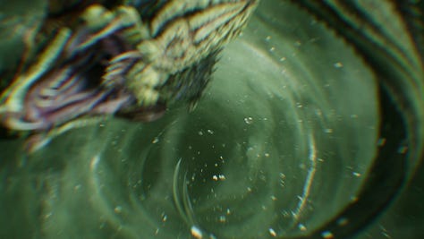 This could be a mere stylistic choice, maybe because they’re under water, but upon closer inspection, that’s not the case. Chromatic aberration is exclusively used in underwater shots after that black miasma covers Cloud’s right eye and face. Shots above water where the snake is flung out of the swamp and onto the tree shows no signs of chromatic aberration.