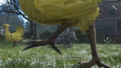 You visit the Chocobo farm, talk to Chocobo Bill who repeats the Chocobos’ ability to cross the swamp and outrun the Midgardsormr you already learned about from his amusing advertisement at the docks.