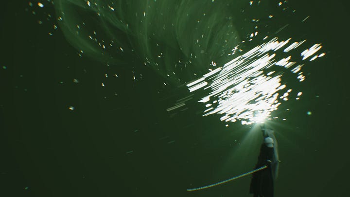 Back under the surface, we see Sephiroth hovering in the water, then looking down to where Cloud should be, who was never visible on-screen between the emergence of the black vortex and now. After Sephiroth clearly looks down into the depths at something specific, the camera switches to Cloud who’s also hovering in the water not far away from Sephiroth before he begins descending into said depths again.