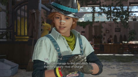 You will then be sent to the barn where his grandson Billy tells you how to catch a Chocobo since al of their rentals are already spoken for. While this segment is generally the same, it contains two key differences. Firstly, you don’t need a Chocobo Lure Materia anymore and secondly, you will receive the Gysahl Greens from his sister Chloe’s shop instead. You also cannot choose to buy any other greens and receive them automatically.
