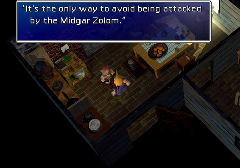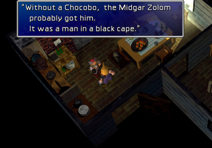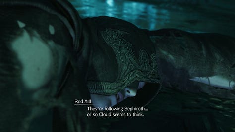 And later, at the start of Barret’s and Red XIII’s gameplay segment, they talk about how those black robes are following Sephiroth, “or so Cloud thinks.“ Barret then raises concerns about whether Cloud can keep it together. Having seen Cloud mistake a black-robed person for Sephiroth and then claim Sephiroth was there to kill the snake despite nobody else seeing Sephiroth in either instance, Barret surely would think that Cloud’s bonkers, hence Barret’s comment about Cloud having lost it again in front of Nibelheim.