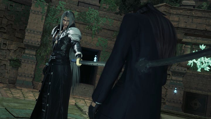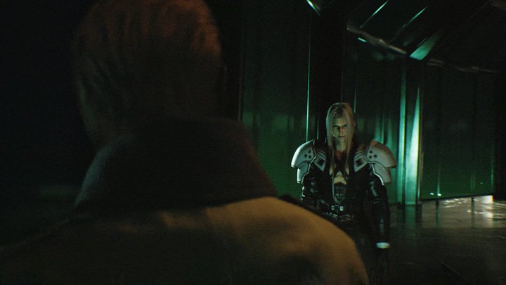 It’s also worth noting that, when Cloud is shown again, the camera moves in such a way that shows Cloud slide into view from behind Sephiroth, as if to reveal him again after being “absent” for a while. I’m positive that this shot wasn’t chosen just for the scene director’s amusement or because it looks cool.