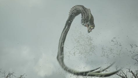 If we look closely, we can spot a blurry Midgardsormr in the background, especially in the second image above. That alone is not worthy of note, so why point it out? Well, we see the snake’s whole body but no Cloud. The Midgardsormr was so focused on his afternoon snack that a mere apparition behind it should not have distracted it to the point of dropping Cloud who already seems to have sunken so far down as to not be visible on screen at this angle. Sephiroth looks downwards at the snake, after all. Unless its bestial instincts recognized a much bigger threat, but not this fast without knowing what’s up before said threat even fully materializes.