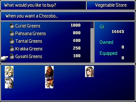 In addition to that, you also need “greens” to keep the Chocobo occupied while you defeat the enemies around it. Those can be purchased from him directly. The more expensive the longer it keeps the Chocobo busy feasting on it.