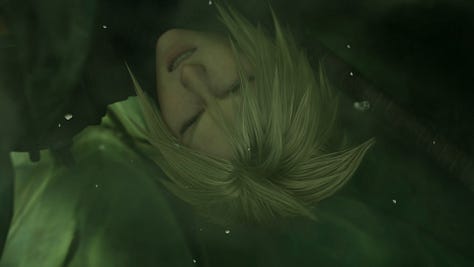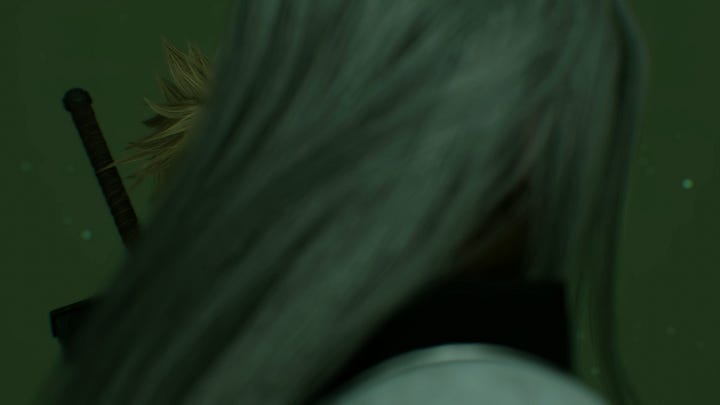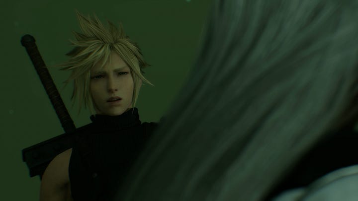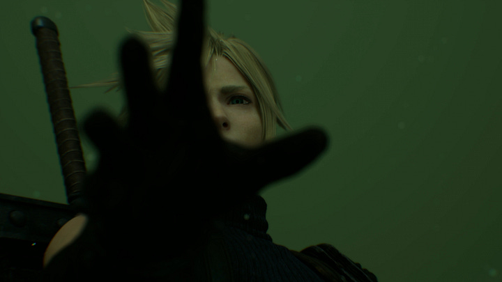 Even more curiously, the scene cuts back to another close-up on Cloud’s face, still overlaid by those green glitch effects. Meaning: something strange is still afoot.