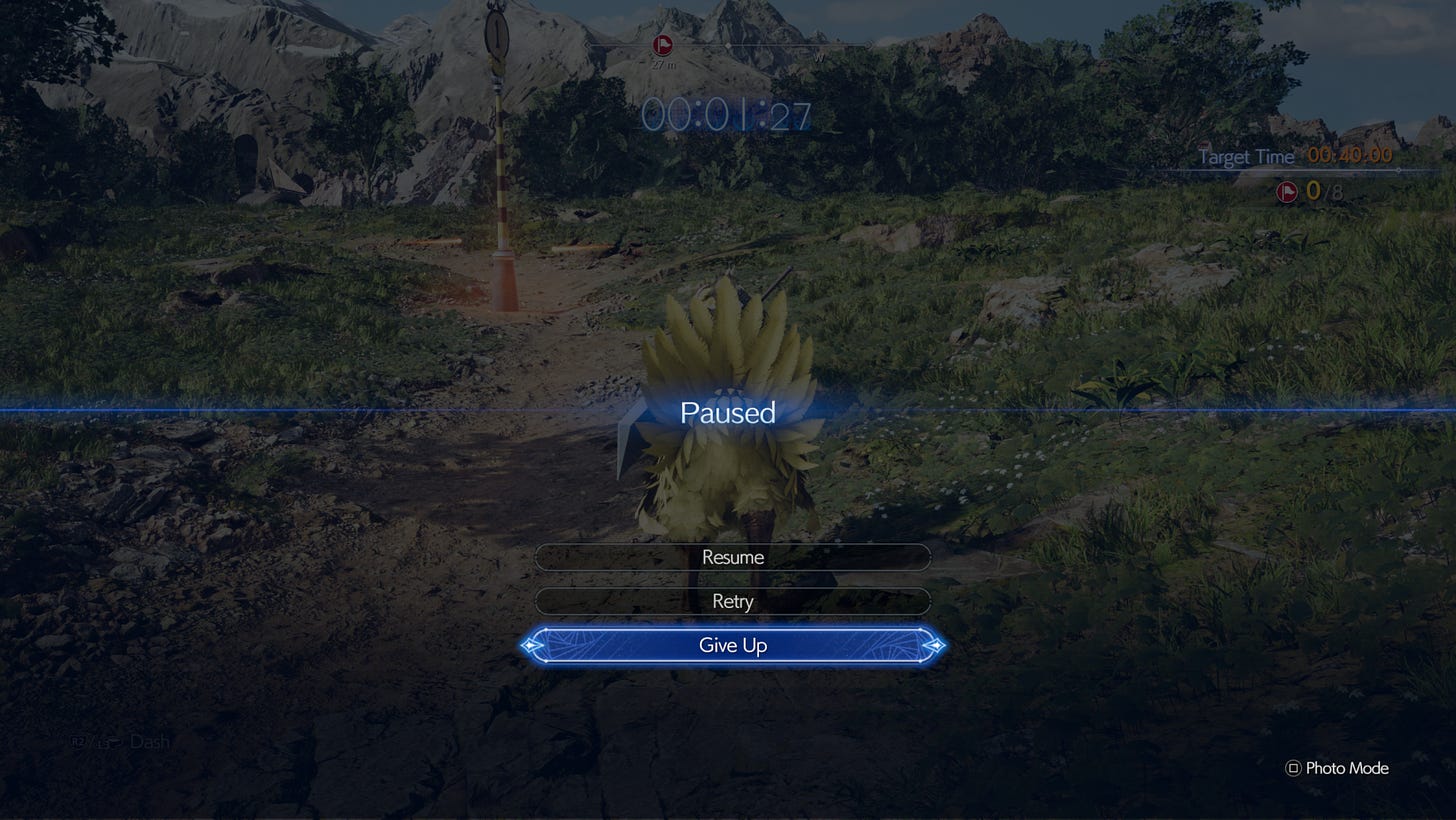 Now comes a step which is completely new to Rebirth. After talking to Chadley and optionally buying some gear for your trusty bird steed, Billy gives you a Chocowhistle that allows you to call Piko from anywhere in the Grasslands.5 However, before you can zoom across this first open-world zone, you first need to complete a test race to get accustomed to riding this majestic bird—and the controls.6