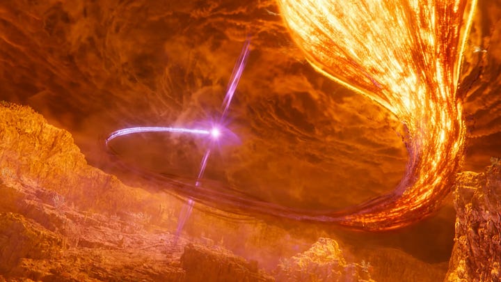 Cloud’s air bubbles rise towards a point above where black and purple smoke and particles gather in a vortex-like pattern.