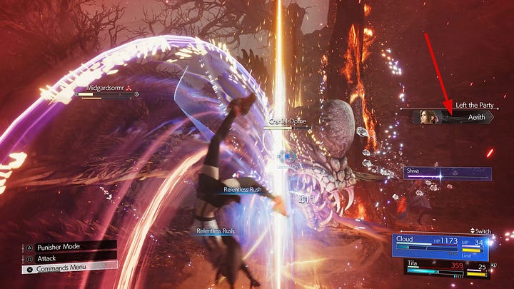I also think that this Midgardsormr scene exists in this form to sow more doubt and tension within the group. Though potentially also for Cloud’s friends to realize how hard the “life” of black-robed individuals must be and to see Cloud potentially becoming one, too.