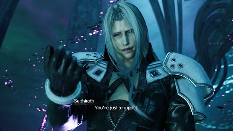 In the original game, Sephiroth, or rather Jenova, calls Cloud a puppet just after defeating Jenova LIFE. In Rebirth, Sephiroth, whose image is overlaid over either another black-robed figure or Jenova’s body itself, calls Cloud a puppet before the battle against Jenova Lifeclinger begins.