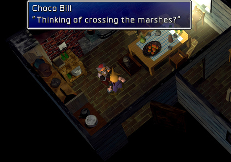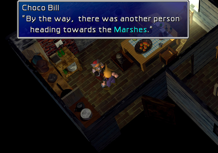 After learning about the means to cross the marsh, Chocobo Bill also lets you know that he has seen another person that was heading to the marshes. However, without a Chocobo, the Midgar Zolom most likely already got him.