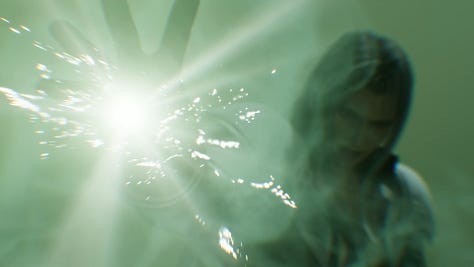 Notice how the fourth picture with both Cloud and Sephiroth being shown from a distance is treated with heavy chromatic aberration again. In addition to that, we can see unnatural rainbow-colored tendrils of light moving around Sephiroth and towards the surface converging at the white light shining from above.