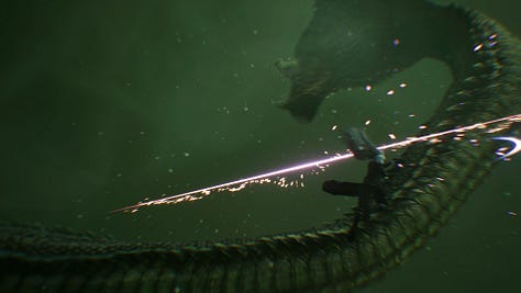 “Sephiroth” fully materializes out of black and purple smoke and particles, and the Midgardsormr is already solely focused on him. Before “Sephiroth” slays the beast and catapults it out of the water, he smirks at his adversary as black streaks of miasma remnants are slithering around his mouth.