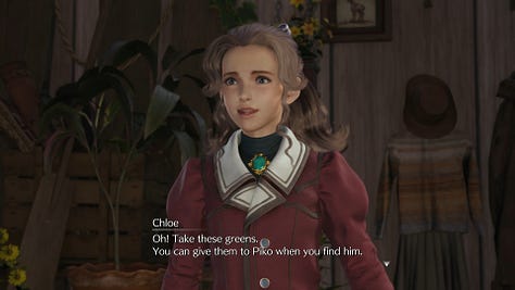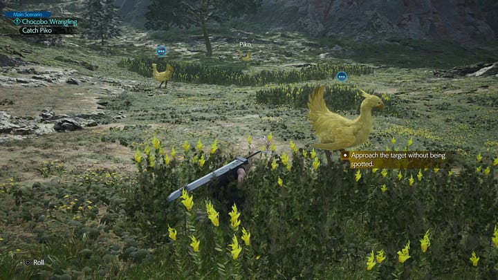 After leaving the farm, you simply follow the path with the Chocobo tracks to where Piko, the runaway Chocobo is currently chilling out. Again, the general sentiment of this section remains the same, but the details differ. Instead of having to get into a battle while moving along Chocobo tracks and then keep the Chocobo busy with eating greens while you dispatch the enemies around it, you need to sneak up to Piko and wrangle him without any of the Chocobos noticing you. After achieving this, the good boy is treated with his favorite food, the Gysahl Greens, which is basically an oversized Raddish.