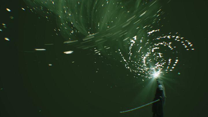 From Cloud’s point of view, the image of Sephiroth fades into the illuminated water surface above. No effects or particles, just a simple fade out.