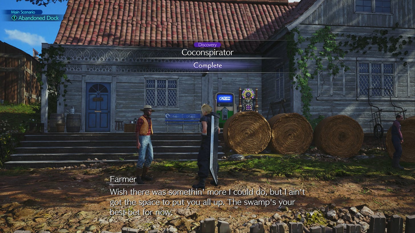 Visiting Oliver’s farm and talking to the main farmer completes the Coconspirator discovery quest and tells you that the swamp is the best place to hole up and hide form Shinra.