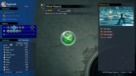 Since Sephiroth uses only level three elemental spells in the original game’s flashback and has all Materia fully mastered in both the original game and Rebirth, it is safe to assume that he also casts Aeroga—the third level wind spell from Final Fantasy VIII onwards—in this scene. Side note: green wind magic Materia does not exist in the original game.