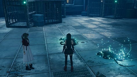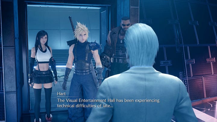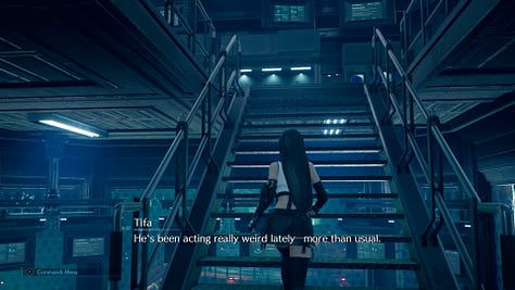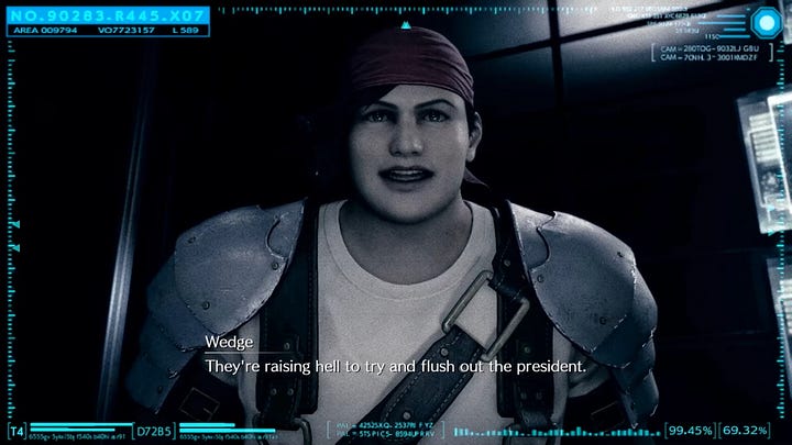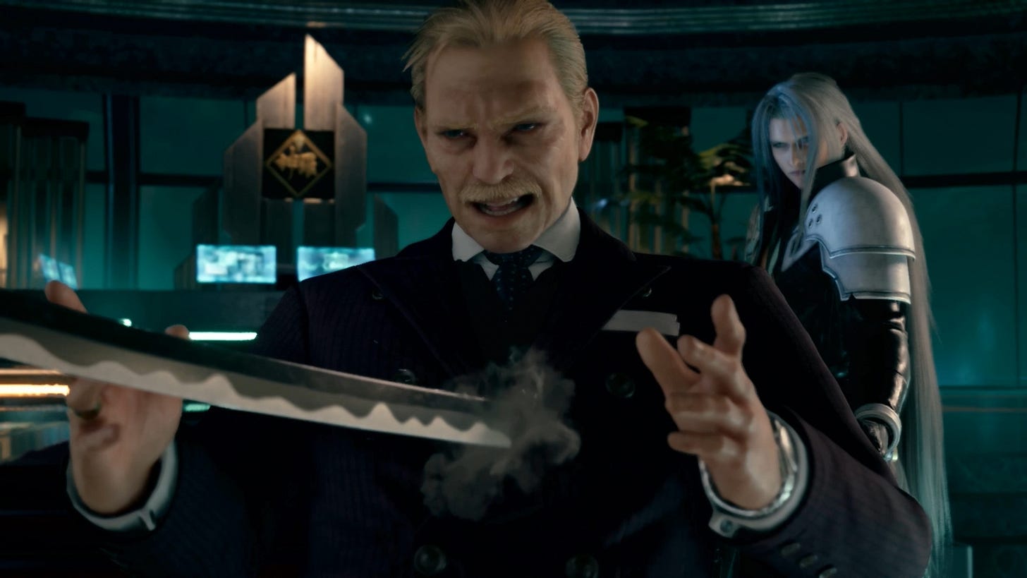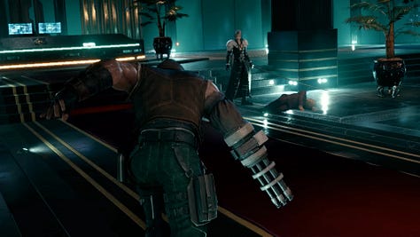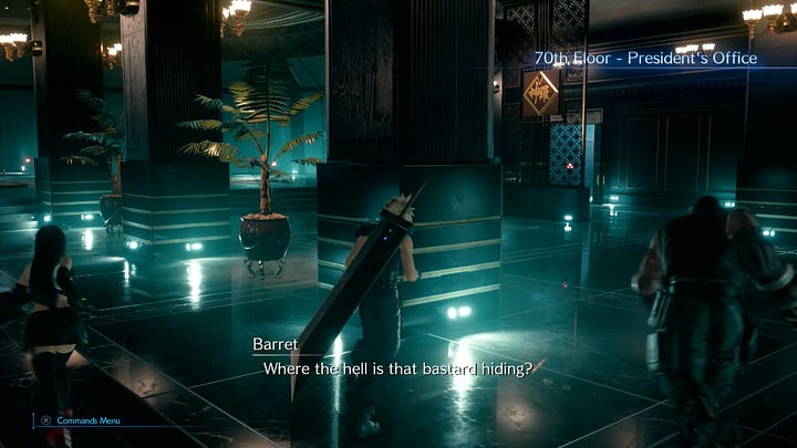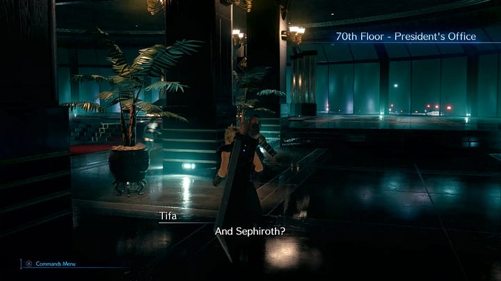 Upon reaching the president’s office, they finally remember that Sephiroth is here. At least Tifa does.
