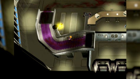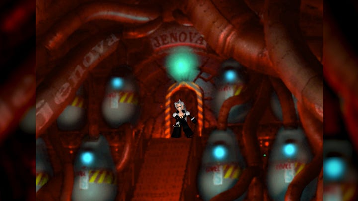 After we beat the entirety of the Drum, we see Sephiroth again briefly on one of Hojo’s monitors. He’s carrying Jenova on his arms, walking towards the elevator leading to floor 69, the one full off purple goo.