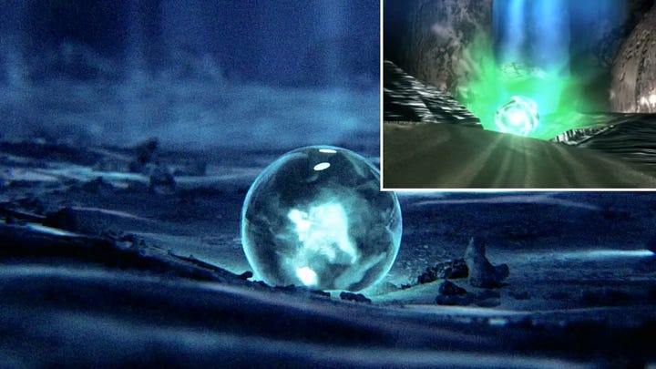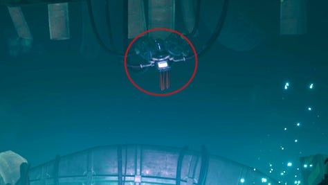 There are more pieces of evidence for this. For one, there are multiple big Mako pipes running into this Visual Entertainment Hall called Cosmos Theater, likely pumping in more Mako than it needs to run. For another, the whole interior architecture goes invisible. This can be seen best by the disappearing lines along the dome. Furthermore, the control pillar in the center, the immediate ground around it as well as the circle where our characters are standing dissolve into fragments. The rest of the ground and circular steps fall into the depths below, leaving spectators seemingly floating in mid-air, which they most certainly are not.