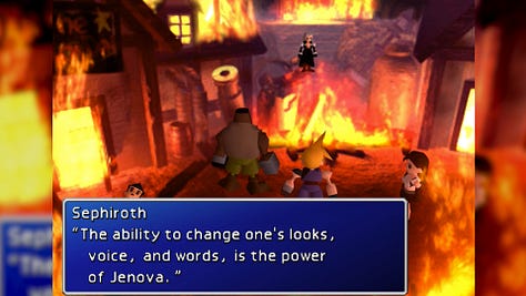 What about Sephiroth’s invisibility before he suddenly appears? Memory manipulation and illusions have been Jenova’s main abilities since the original, so he could have just made use of those. Just like shapeshifting, as we’ll see in the next segment.