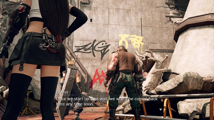 When they reach the destroyed tank, again, Tifa does drop a remark that they’re here, again.
