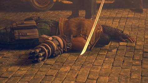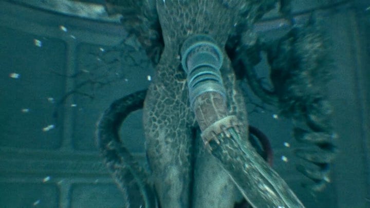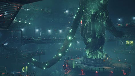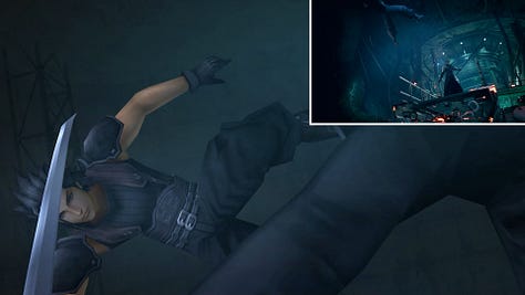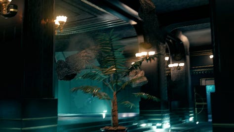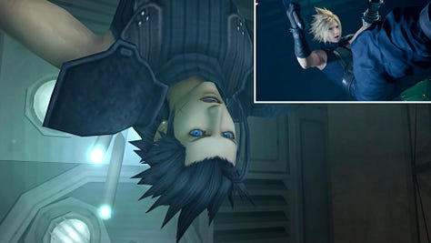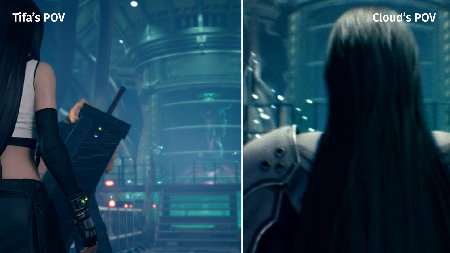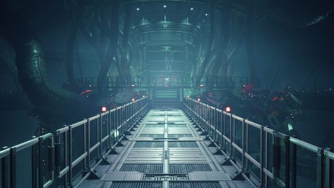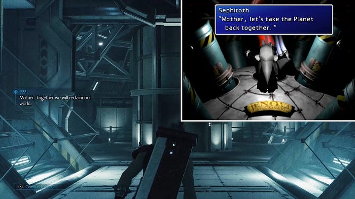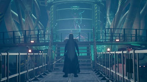 While not germane to this analysis, we do need to address the elephant in the room: the missing blood. We think it’s a mixture between keeping the rating low and the changed circumstances.10 In the original, Jenova’s body escaped on its own after being activated by cloud’s proximity, leaving death and destruction in its wake due to being mainly instinctual, hence the dead bodies and the claw marks on the walls.