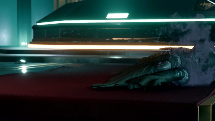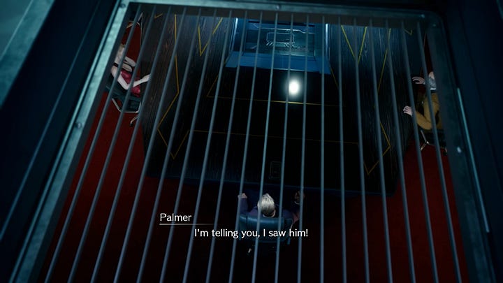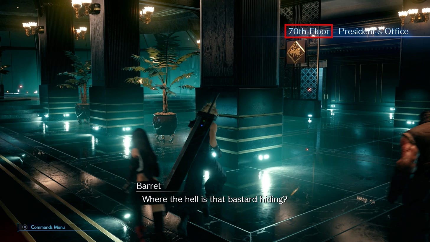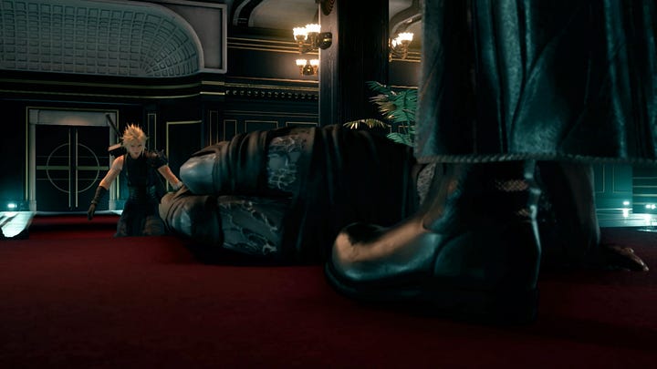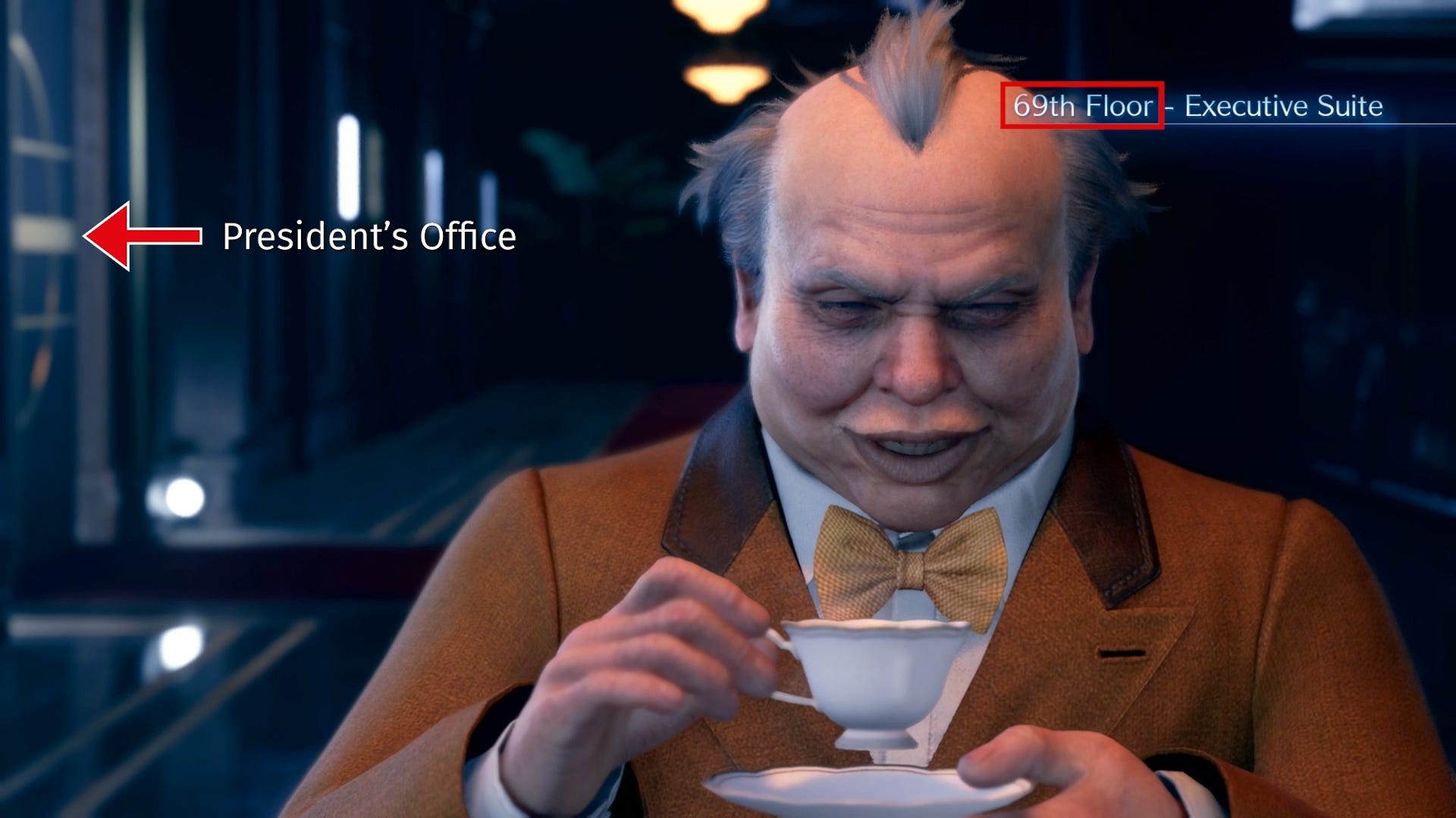 Right after Cloud utters Sephiroth’s name, we switch to Palmer, who is walking along the red carpet leading past President Shinra’s office on the 70th floor and not on the 69th as the label wants you to believe.