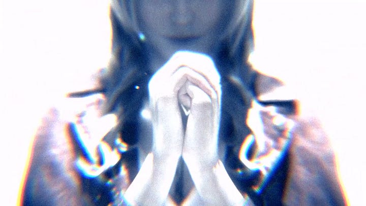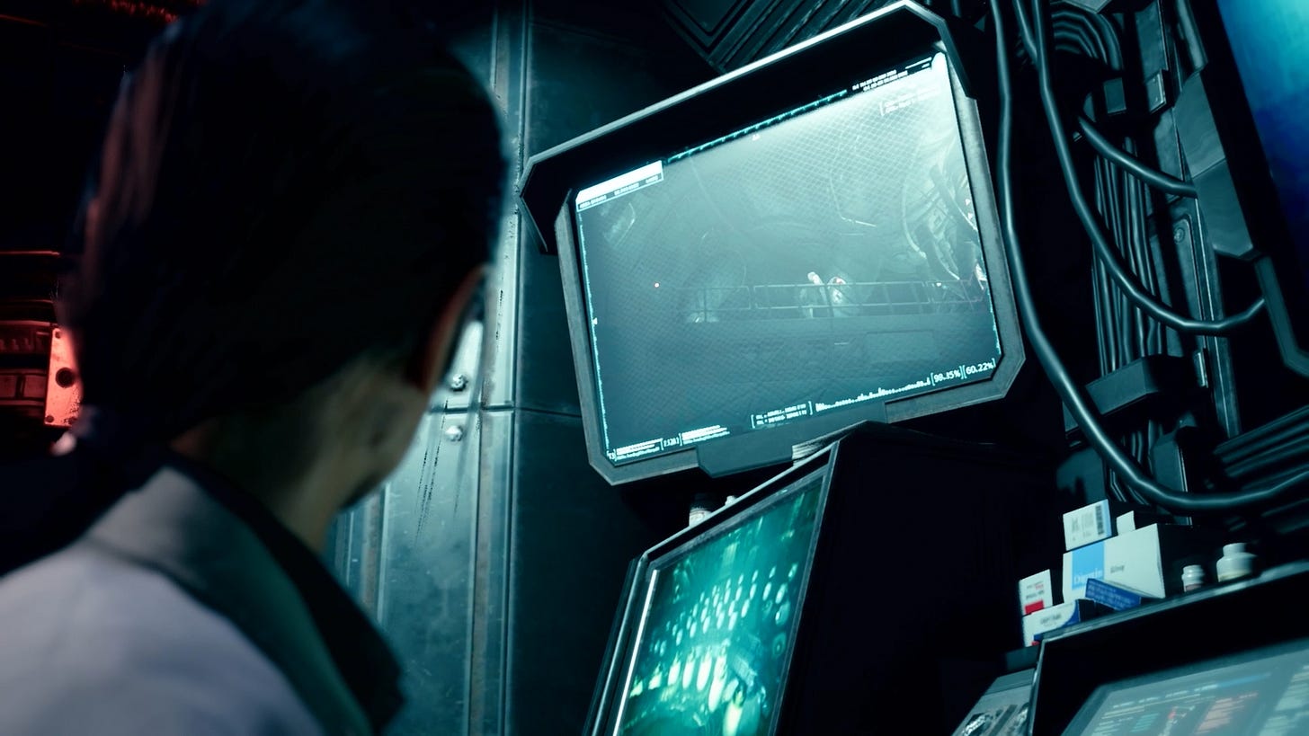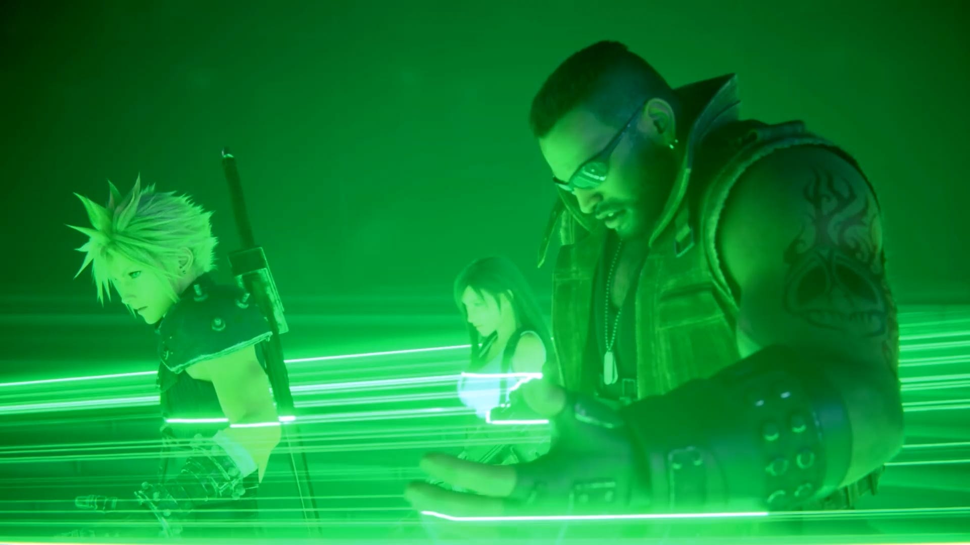 We know it’s a vision of the future because it starts with this green glitch effect, which happens again when transitioning to Aerith and then back to Cloud who even holds his hand against his head, as if in pain.