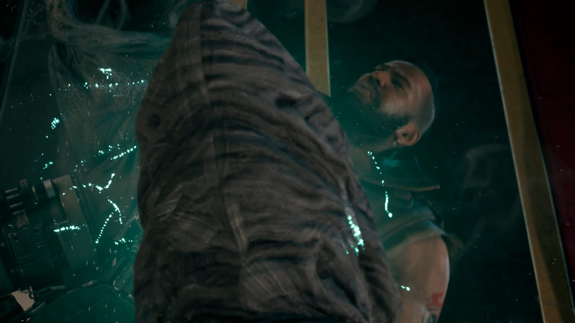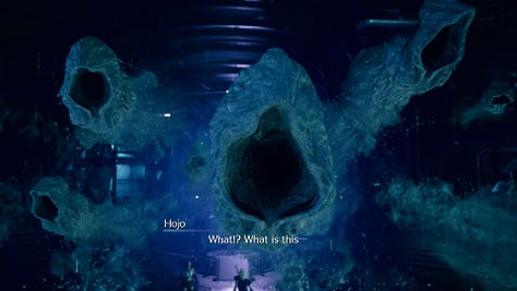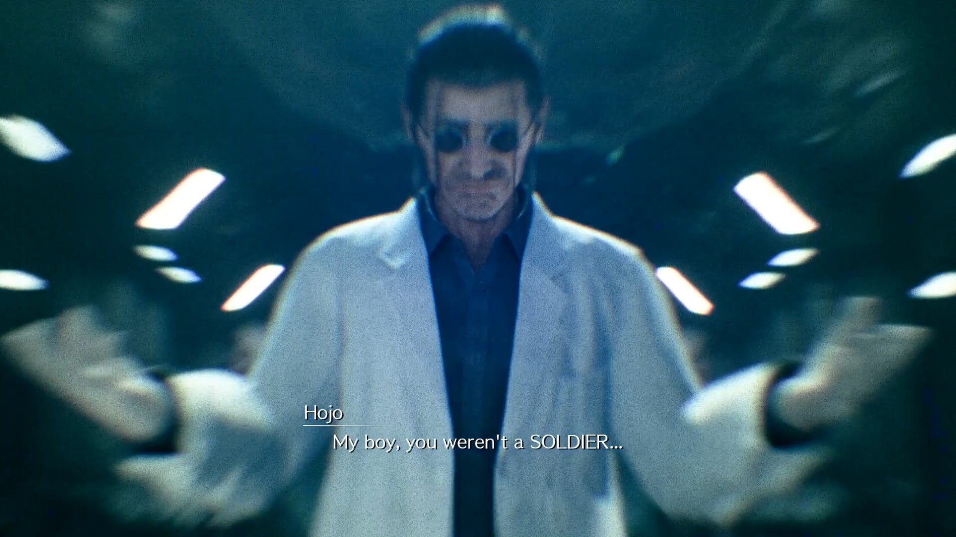 Before Hojo can speak any further, Cloud’s mind blocks out the truth, as we can see by the green glitch effect. Furthermore, a number of Whispers appear and carry Hojo away to prevent him from revealing even more.