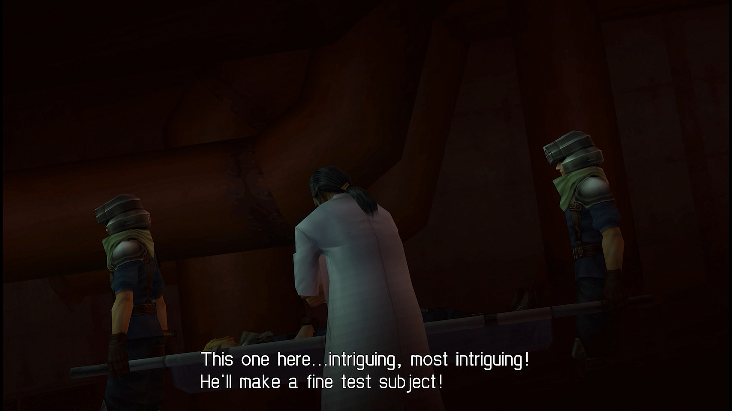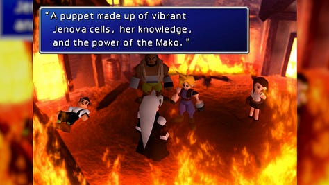 Eventually, they find Aerith, but Hojo is already a step ahead and prepared a small squadron of Shinra combatants for them to fight. After an easy victory, Cloud gets a bit too cocky, which leads Hojo to look a bit closer and shamelessly spill the beans.