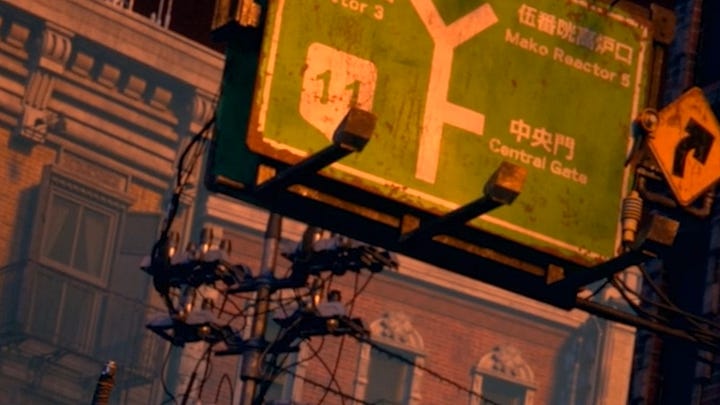 Why sector 4? Because the street sign above contains a fork junction leading to Mako reactor 5 to the right and sector 3 to the left. Why sector 4 specifically? Maybe it provided the best view on the Shinra building for this fantastic wallpaper shot with Cloud and Sephiroth? Or maybe because the clip this pre-rendered showcase is based on depicts the original game’s ending where Meteor descends upon Midgar, in which the Shinra building is shown from the perspective of sector 4 twice.