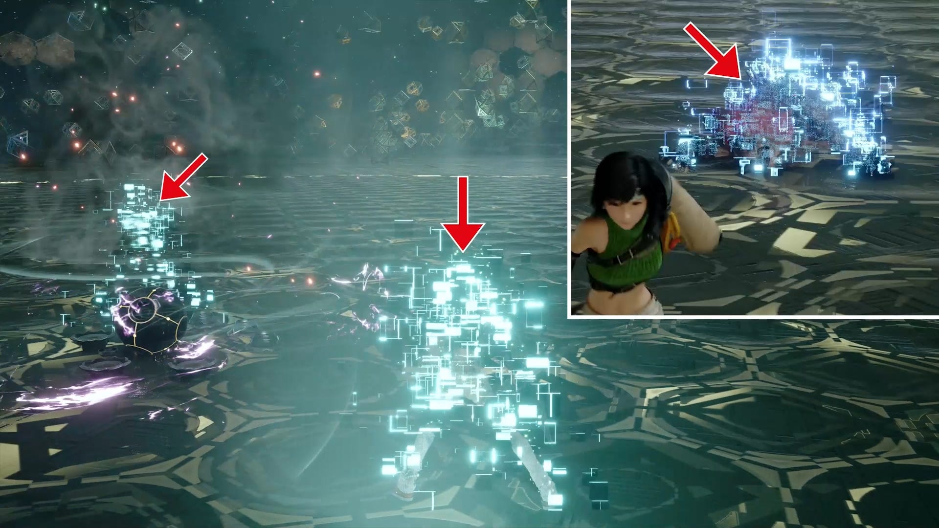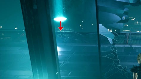 Cloud also experiences another glitched vision here, triggered by the destruction of Midgar. He sees Meteor from space, Aerith praying on the altar, and the Holy Materia underwater.